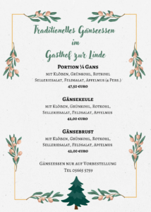 Hallo liebe Gäste, wir wünschen Ihnen alles gute für das neue Jahr 2024.Vom 02.01.2024 bis zum 12.01.2024 haben wir Betriebsferien. Bleibt alle gesund Liebe GrüßeFamilie Löberund das Team des Gasthof zur Linde